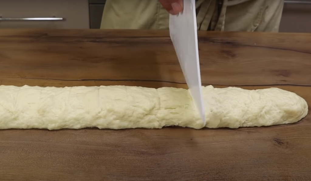Każdy kawałek rozwałkuj na płaski placek i zrób na nim nacięcie do połowy kółka.