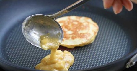 Na rozgrzaną patelnię nalewamy porcje masy bananowo jajecznej. Gdy na cieście zaczną pojawiać się pęcherzyki powietrza odwracamy nasz naleśnik na drugą stronę. Tak postępujemy aż do wyczerpania całej masy. Ilość naleśników zależy od ich wielkości.