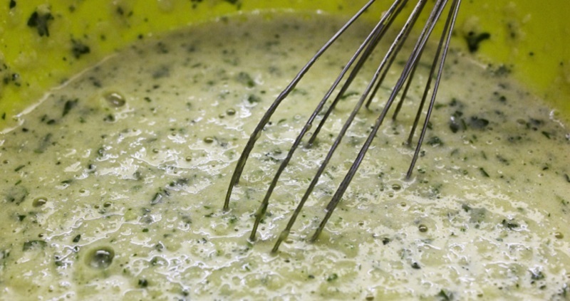 Pietruszkę drobno posiekać. Jajko ubić z solą, dodać do niego mleko, wszystko razem wymieszać za pomocą miksera lub trzepaczki.