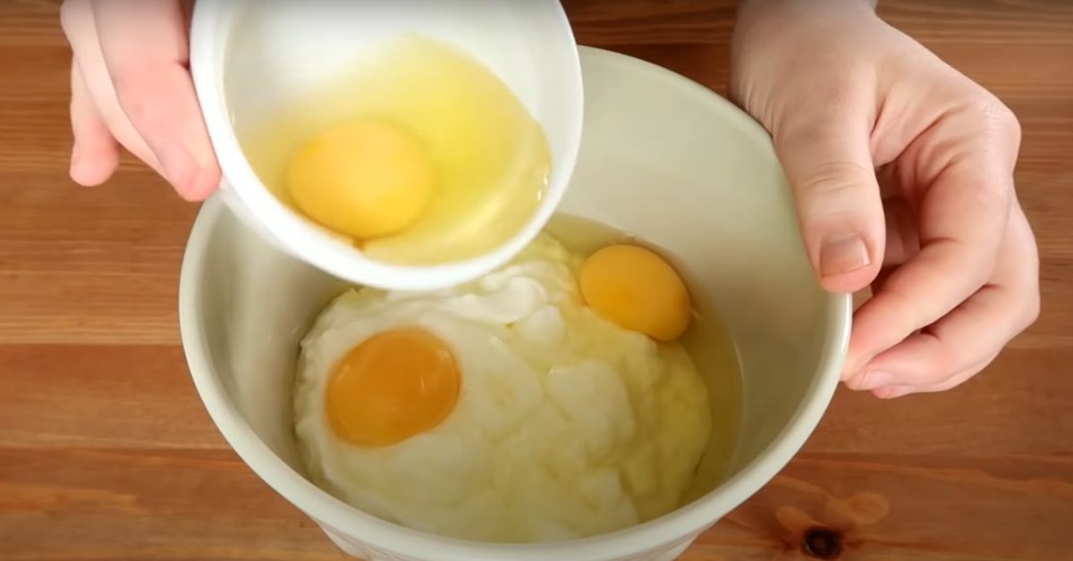 Przygotuj głęboką miskę i wlej do niej swój ulubiony jogurt. Następnie idziesz żółta jaj i dodaj je do miski z jogurtem. Kolejnym elementem jest przesianie mąki kukurydzianej i wsypanie jej do miski.