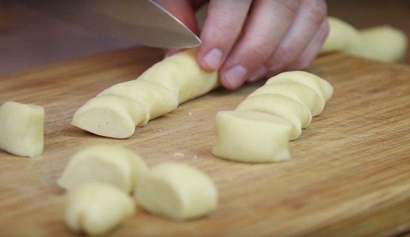 Ciasto wyłóż na stolnicę lub śliski blat i bez podsypywania mąki ulep wałek tak, aby można go było pokroić na małe kawałeczki o średnicy 2 – 3 centymetry.