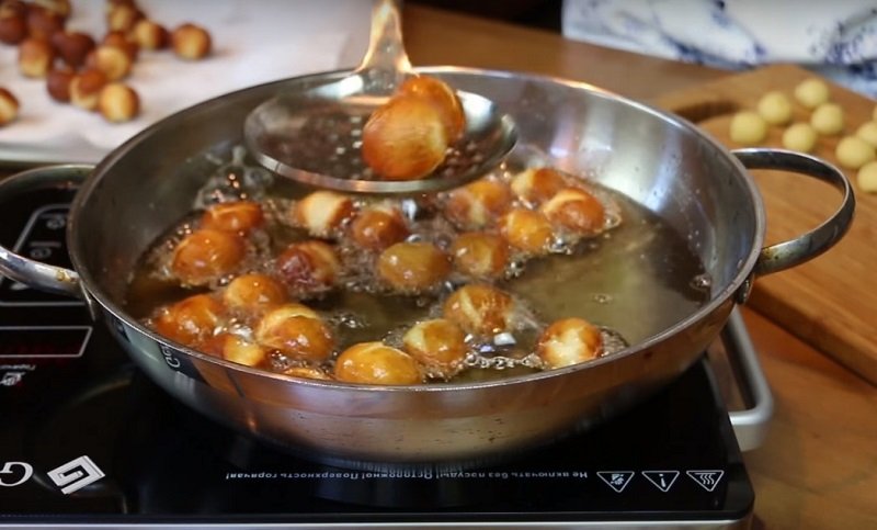 Uformuj kuleczki i wrzucaj je na rozgrzany tłuszcz. Smaż na małym ogniu obracając je – aż uzyskają złoty kolor.