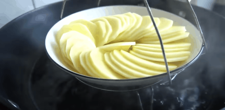 Obierz ziemniaka, a następnie pokrój go na cienkie plasterki. Gotuj ziemniaki w wodzie przez 20 minut, aż staną się miękkie.