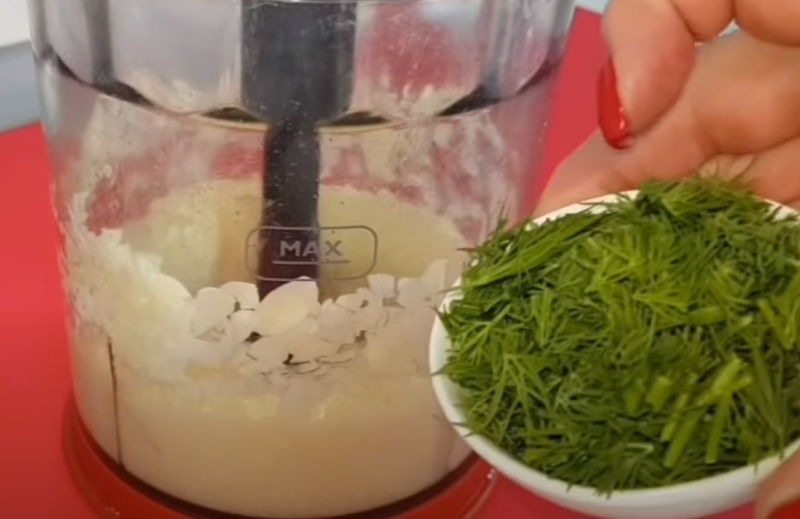 Czosnek obieramy i blendujemy na gładką masę. Dodajemy do niego posiekany drobno koperek, sól, oliwę i ocet i jeszcze przez chwilę dokładnie ubijamy.