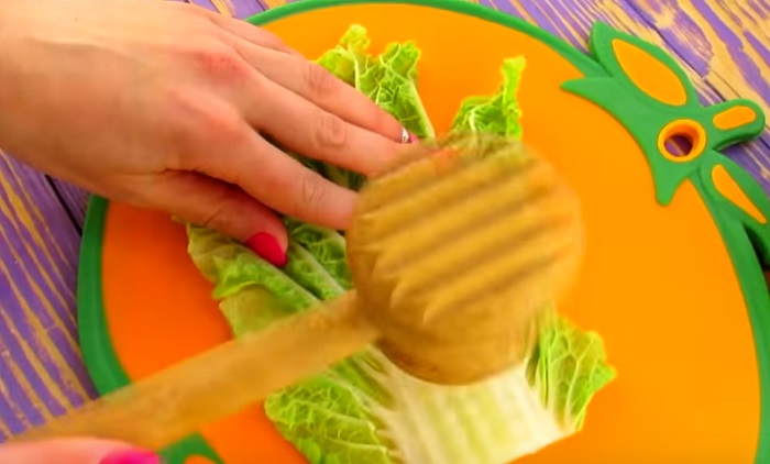 Chcemy, aby roladki rozpływamy się w ustach, dlatego rozbicie liści jest tu konieczne. W ten sam sposób przygotuj każdy kolejny liść.