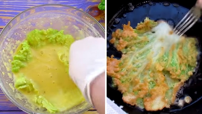 Wymieszaj na gładko całą masę, do połączenia się wszystkich składników. W tak przygotowanym cieście zamocz każdy liść i smaż każdy z obu stron na rozgrzanej patelni wcześniej posmarowanej olejem.
