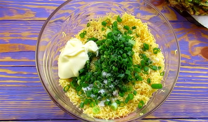 Usmażone na złoto liście odsącz z nadmiaru tłuszczu, umieszczając je na ręczniku papierowym. Wszystkie składniki potrzebne do przyrządzenia farszu pokrój w drobną kostkę i dopraw do smaku pieprzem oraz solą.