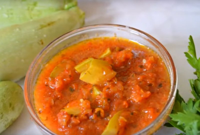 Cukinię obieramy i i kroimy w plastry. Pomidory kroimy w kostkę. Cebulę obieramy i kroimy w ćwiartki. Pokrojone warzywa, obrane ząbki czosnku i natkę pietruszki mielimy w maszynce do mięsa. Powstałą masę układamy na patelni. Paprykę myjemy i kroimy w drobną kosteczkę. Dorzucamy ją do warzywnej masy. Wszystko doprawiamy solą i cukrem, dolewamy olej i dusimy przez ok. 30 minut.