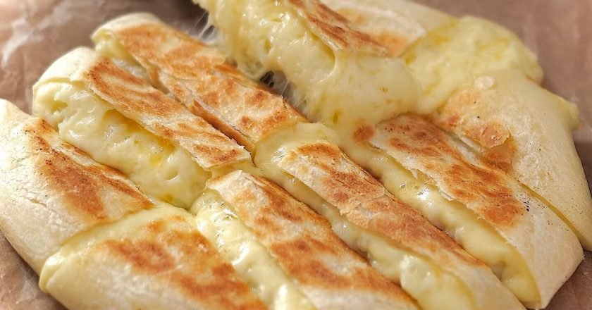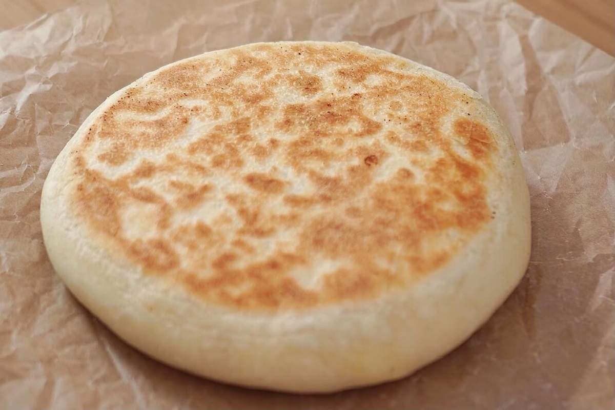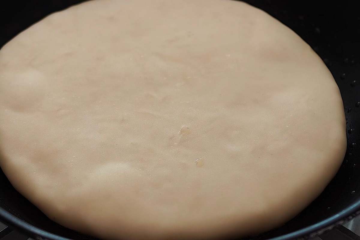 Połącz brzegi ciasta, zamknij je, a następnie wałkiem do ciasta lekko je rozwałkuj. Gotowe ciasto połóż na rozgrzaną i wysmarowaną tłuszczem patelnię.