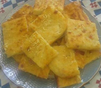 Przełóż do miski, oprósz mąką i przykryj ściereczką. Zostaw do podwojenia rozmiaru. Rozwałkuj ciasto na grubość 1,5-2 cm naleśnika. Posyp czosnkiem wymieszanym w 2 łyżkach oleju oraz wody.