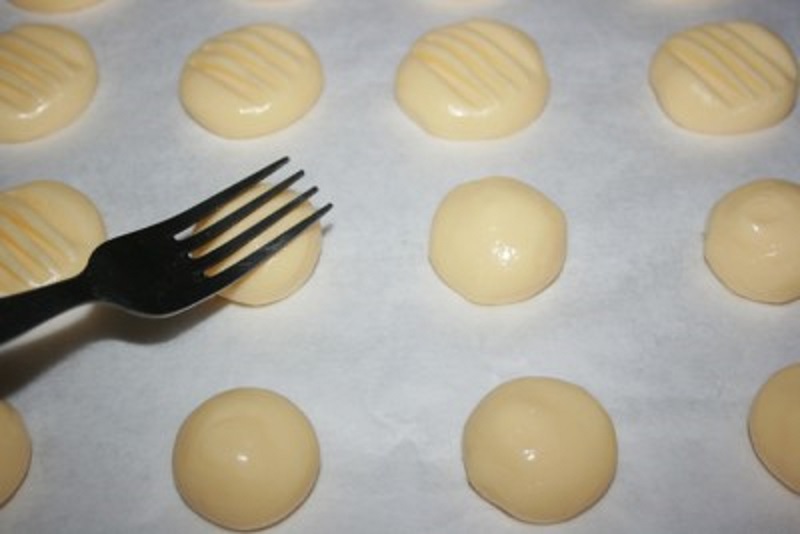 Odrywaj powoli małe kawałki ciasta i formuj z nich kulki, mniej więcej wielkości orzecha włoskiego. Wyłóż płaską blachę papierem do pieczenia. Piekarnik rozgrzej do 180 stopni. Na blaszce układaj w sporej odległości od siebie uformowane kulki. Za pomocą widelca lekko rozgniatamy je, aby powstały płaskie krążki.