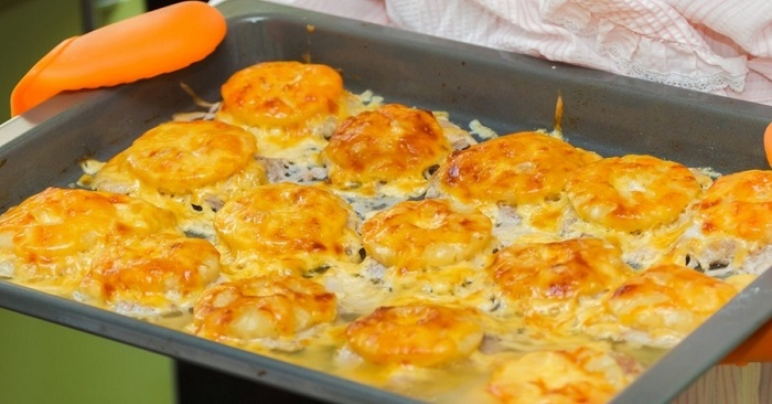 Takie mięsne talarki możesz już ułożyć na blaszce starając się zachować pomiędzy nimi odstęp. Na mięsie ułóż kolejno cebulkę, jajko z majonezem i tarte ziemniaki.