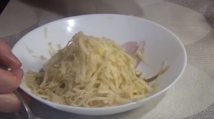 Kolejnym krokiem będą jaja – należy je ugotować i podobnie, jak w przypadku ziemniaków, poczekać chwilę aż ostygną. Następnie posiekaj je drobno i wymieszaj dodając majonezu. Zetrzyj ser, tym razem na stronie tarki z drobnymi oczkami.