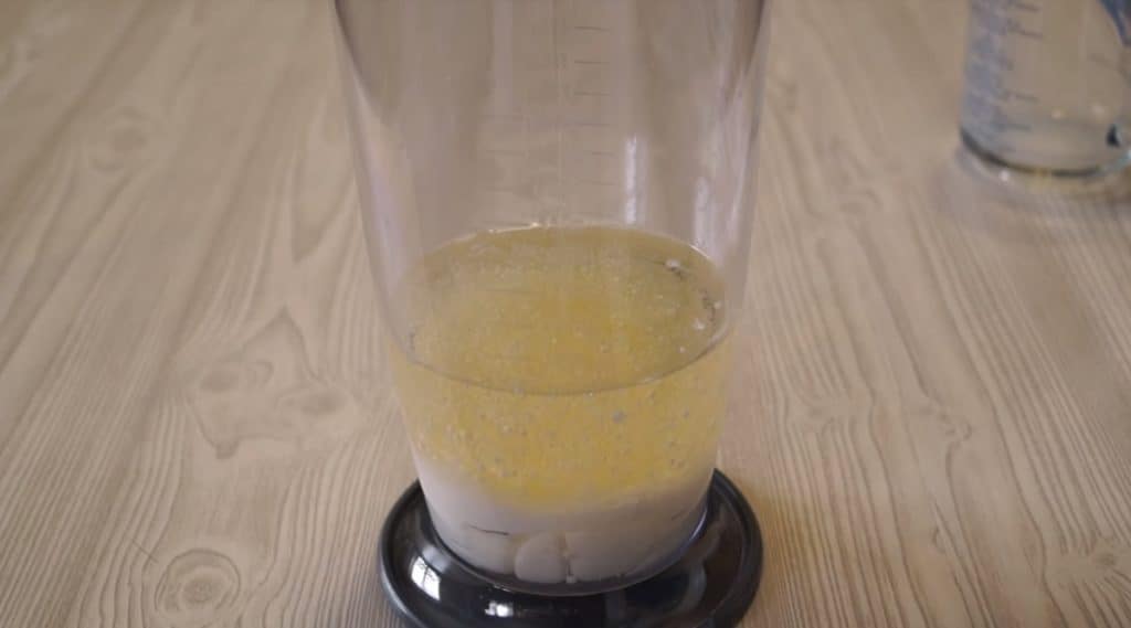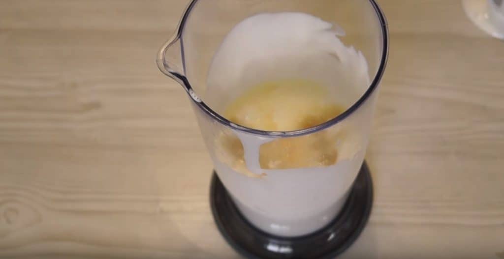 Mleko i olej o temperaturze pokojowej (warunek konieczny, aby majonez się udał) należy wlać do pojemnika, a nastepnie wymieszać oba składniki za pomocą ręcznego blendera.