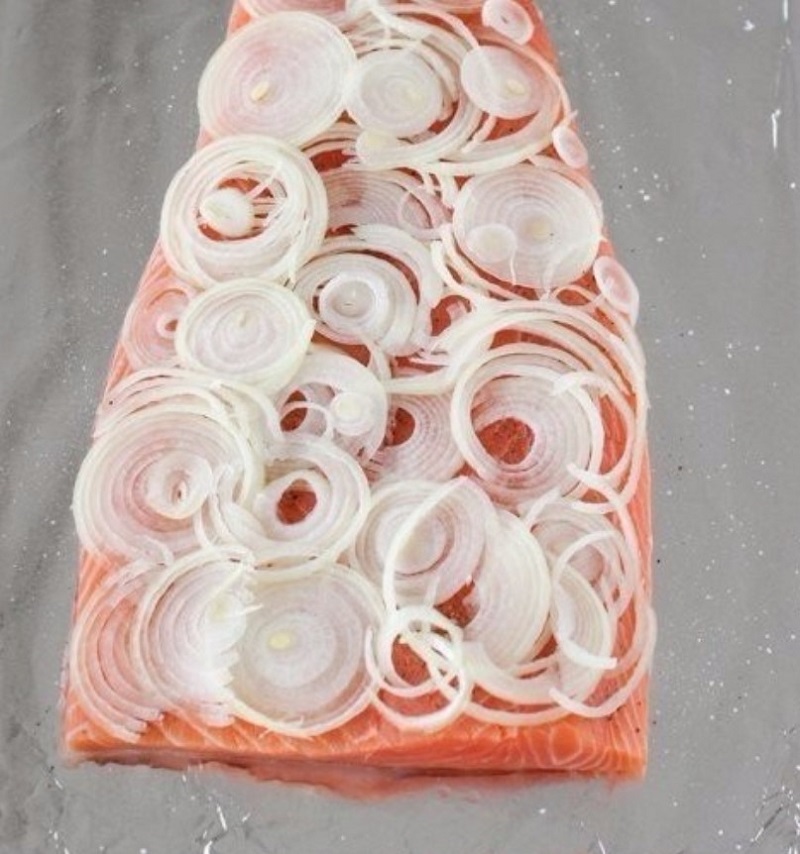 Cebulę należy obrać i pokroić w cienkie plastry. Rozsypać ją na rybę.