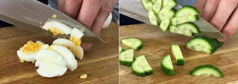 Ugotowane jajka obrać i drobno posiekać lub zetrzeć na tarce. Ogórka pokroić w półplasterki.
