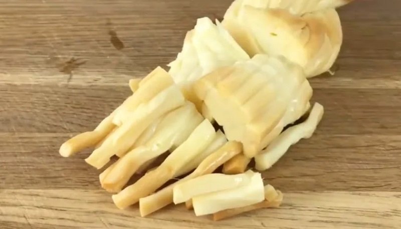 Serowy warkocz pokroić w cienkie paski.