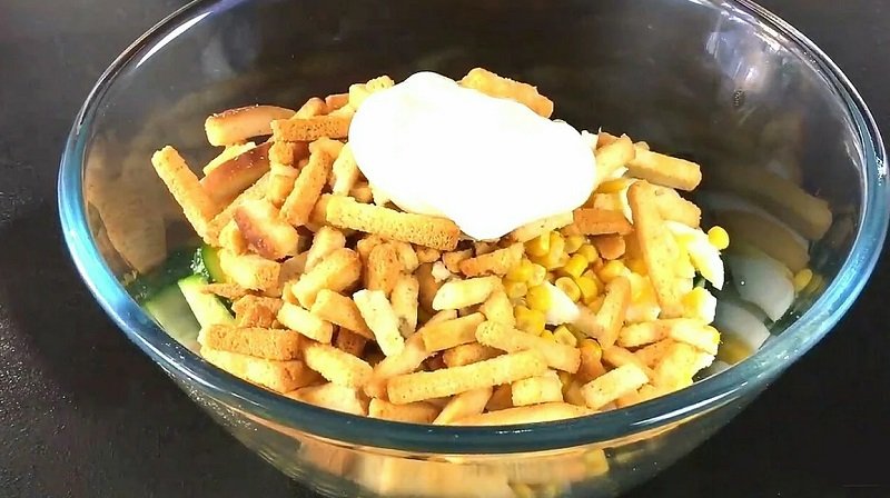 Do jajek i ogórka dodać kukurydze i paski sera, dodać majonez i wszystko wymieszać.