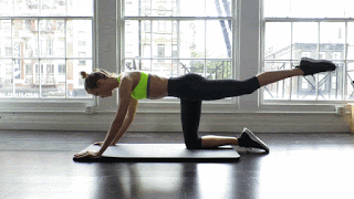 Ćwiczenie wpływa na mięśnie brzucha i kręgosłupa oraz pośladki. Ułóż się w pozycji „na czworaka” i unoś do góry najpierw nogę prawą (20 razy), następnie nogę lewą (20 razy).