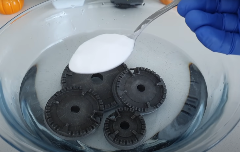 Najpierw umieść palniki w garnku lub misce odpornej na wysoką temperaturę. Zalej je gorącą wodą, tak aby cale były w niej zanurzone i dosyp łyżkę sody oczyszczonej.