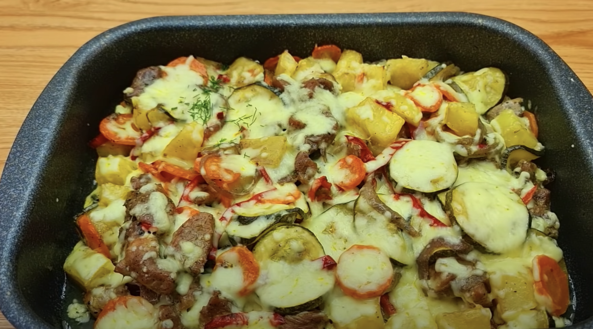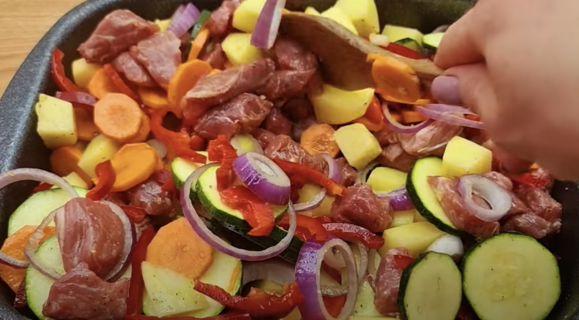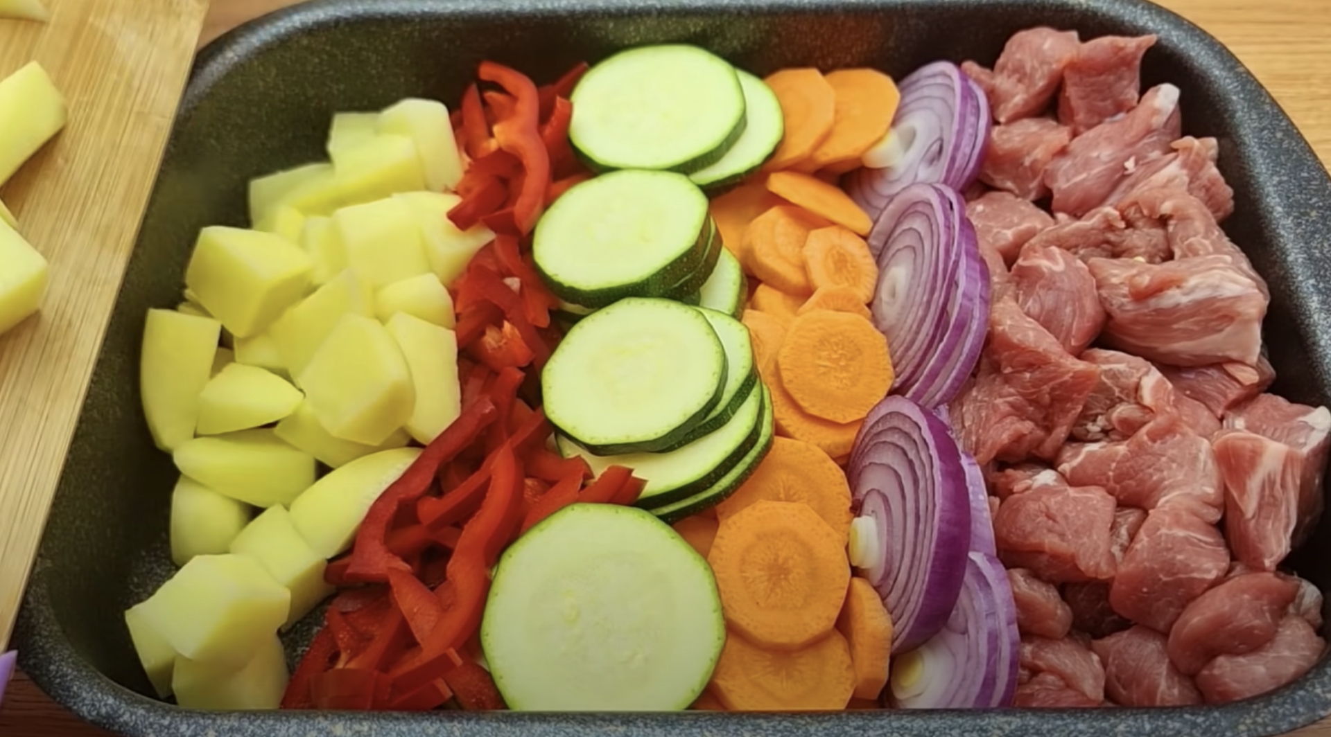 Mięso i ziemniaki pokrój w grubszą kostkę, cebulę w krążki, cukinię i marchew w plasterki, a paprykę w słupki. Składniki ułóż na blaszce do pieczenia.