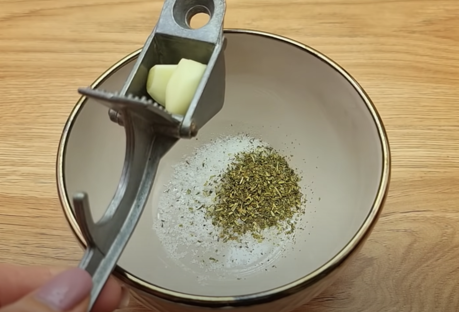Przygotuj sos: do miseczki wlej olej, dodaj do niego przeciśnięty przez praskę czosnek, przyprawy i sól. Warzywa i mięso ułożone na blaszce polej sosem i całość dokładnie wymieszaj.
