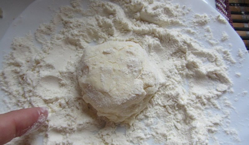 Margarynę (w pokojowej temperaturze) rozgnieć widelcem lub palcami na papkę. Dodaj do niej śmietanę, proszek do pieczenia oraz mąkę pszenną. Wszystko dokładnie wymieszaj. Ciasto nie powinno kleić się do rąk lecz powinno być miękkie.