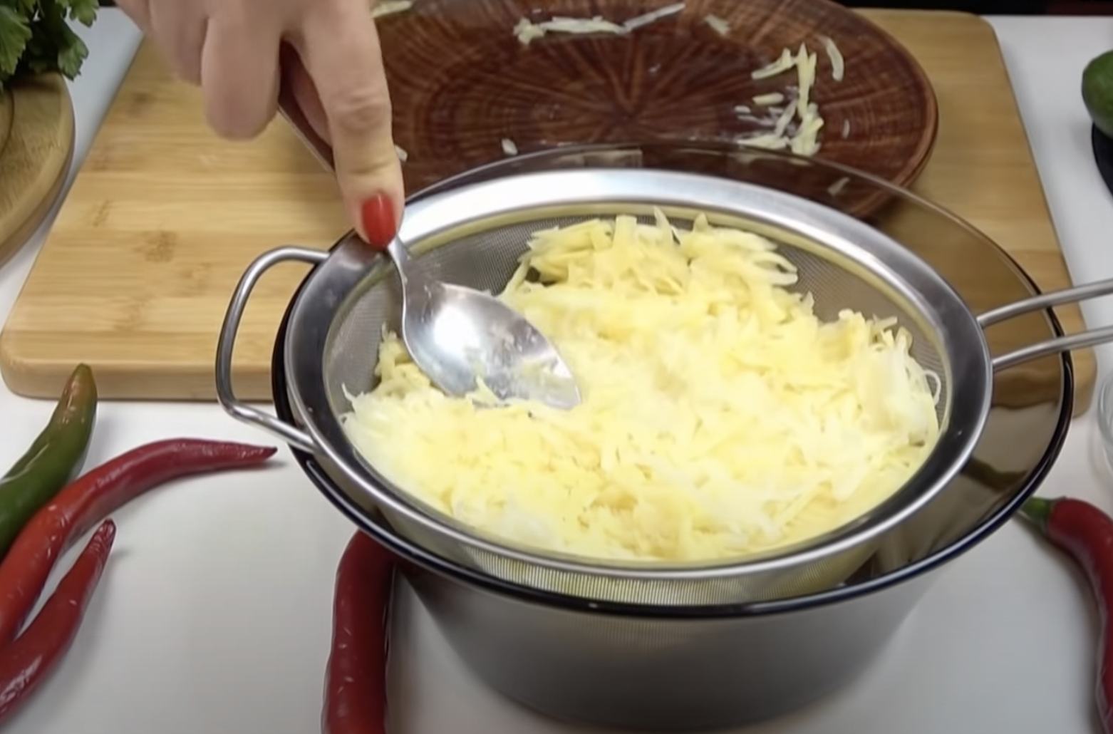 Obierz ziemniaki i zetrzyj na tarce. Przełóż na sitko i wyciśnij nadmiar soku.