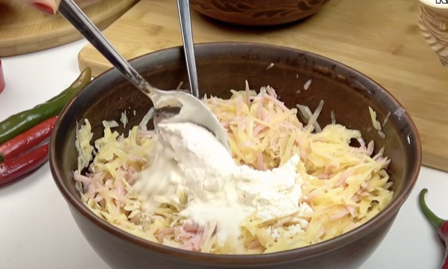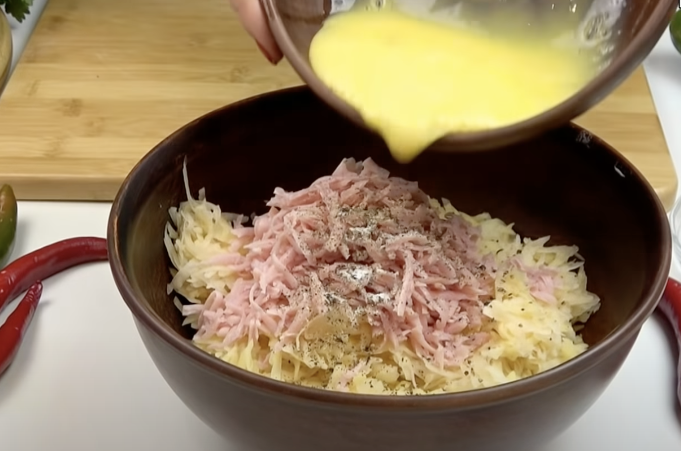 Szynkę posiekaj drobno lub zetrzyj. Dodaj do ziemniaków, dopraw i dokładnie wymieszaj.