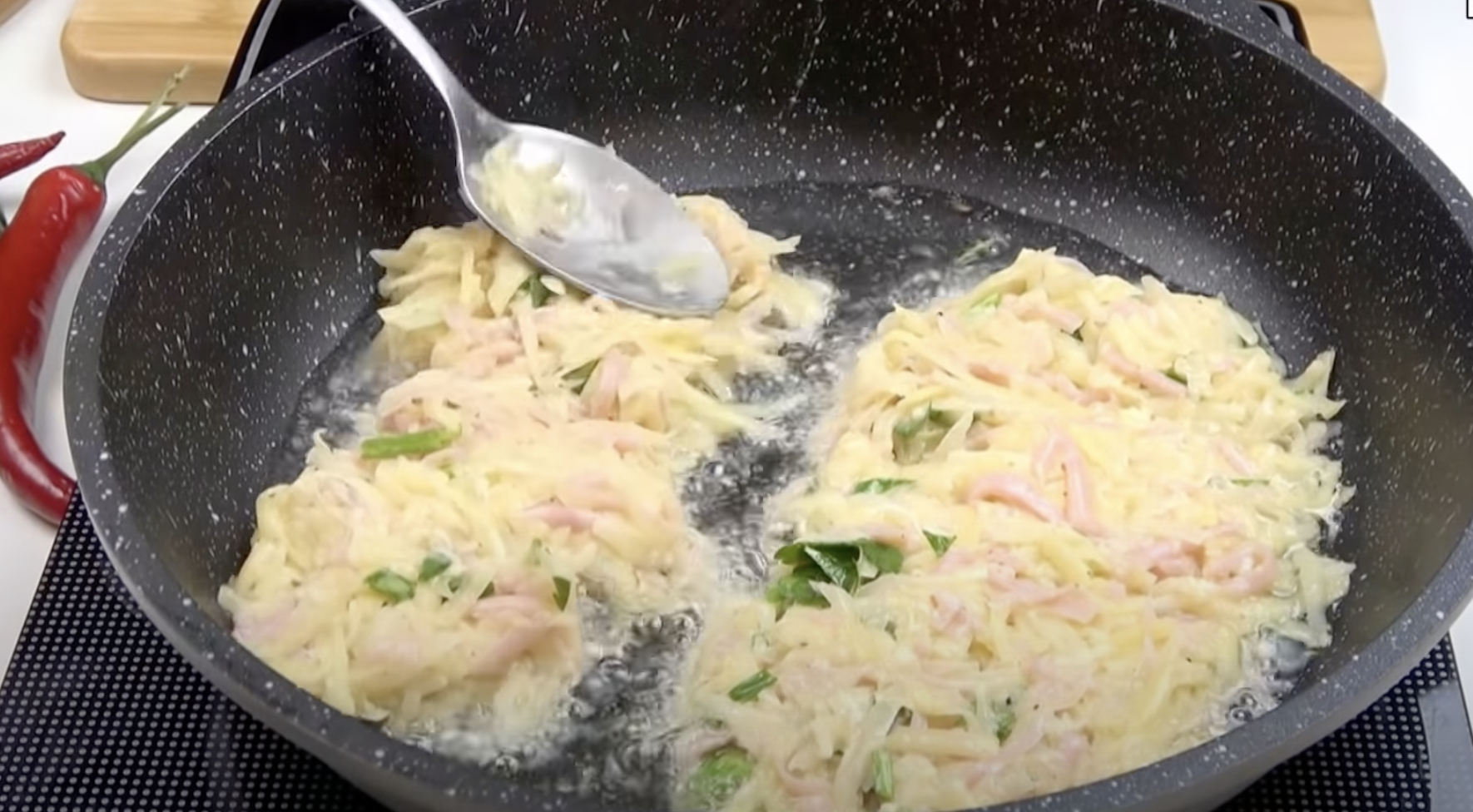 Rozgrzej na patelni olej. Układaj na nim porcje masy, formując placki.