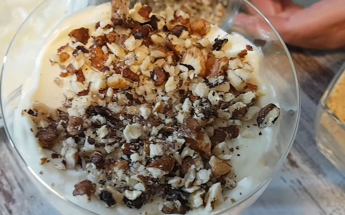 Warstwy można układać w pucharku, blaszce czy naczyniu żaroodpornym. Wszystko zależy od indywidualnych preferencji. Najniższą warstwę warto rozpocząć do wyłożenia biszkoptów oraz orzechów, a następnie położyć masę i znowu przykryć ją biszkoptami i orzechami.