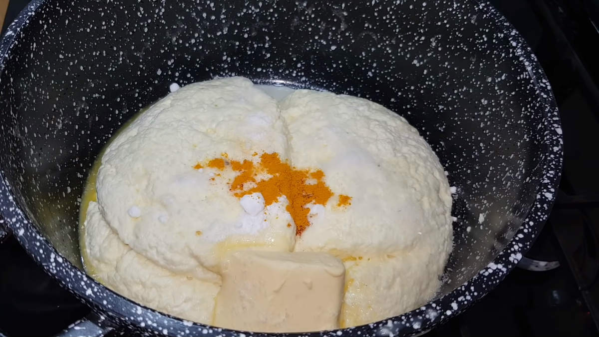 Twaróg przełóż do durszlaka – postaraj się odsączyć go całkowicie z serwatki. Następnie dodaj do niego sól, kurkumę, sodę oczyszczoną oraz masło. Twaróg gotuj na średnim ogniu, nie zapominając o mieszaniu – gdy masa stanie się gładka, dodaj wszystkie pozostałe składniki poza ziołami i gotuj przez kolejne 3 minuty.