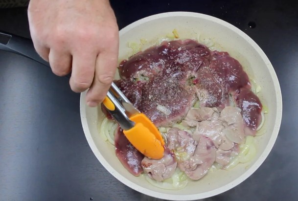 Na cebulę z czosnkiem kładziemy pokrojoną wątrobę. W trakcie smażenie nie doprawiamy jej solą, aby nie stwardniała. Smażymy. Po 2 minutach odwracamy wątróbkę i smażymy na drugiej stronie.