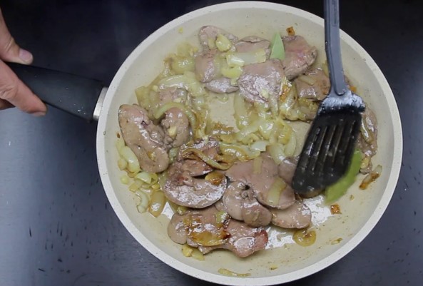 Teraz można doprawić danie i dodać 2 liście laurowe, dokładnie wymieszać. Tak przygotowaną wątróbkę smażyć jeszcze przez 2 minuty.