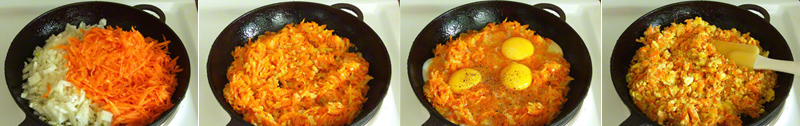 Najpierw dokładnie umyj warzywa, a następnie je obierz. Zetrzyj marchewkę i posiekaj cebulę. Rozgrzej patelnię i wlej na nią olej. Dodaj warzywa, przykryj przykrywką i smaż całość przez 10-15 minut. Uważaj, by warzywa się nie przypaliły! Możesz dodać wody, co pozwoli zwiększyć soczystość marchewki.