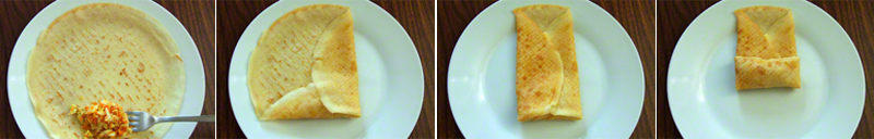 Przygotuj także naleśniki, a następnie dodaj do nich farsz. 1-2 łyżki farszu kładziemy na krawędzi naleśnika i tworzymy z niego kształt koperty.