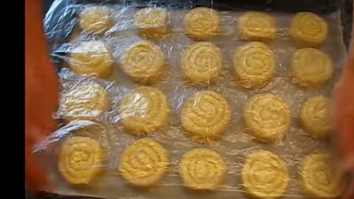 Gdy ciasto jest już gotowe, rozwałkuj je na prostokąt o grubości 1 cm. Rozłóż na nim nadzienie, a następnie zwiń w wałek. Pokrój wałek na niezbyt grube kawałki. Przygotuj dużą blachę, rozłóż na niej papier pergaminowy i w równych odstępach układaj przygotowane ślimaczki.