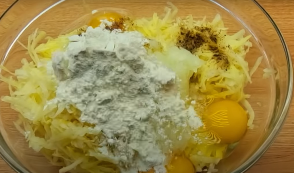 Ziemniaki odsącz z wody i włóż do suchej miski. Następnie dodaj do niej startą cebulę, sól, pieprz, 2-3 łyżki mąki, 3 jajka, później dokładnie wszystko wymieszaj.