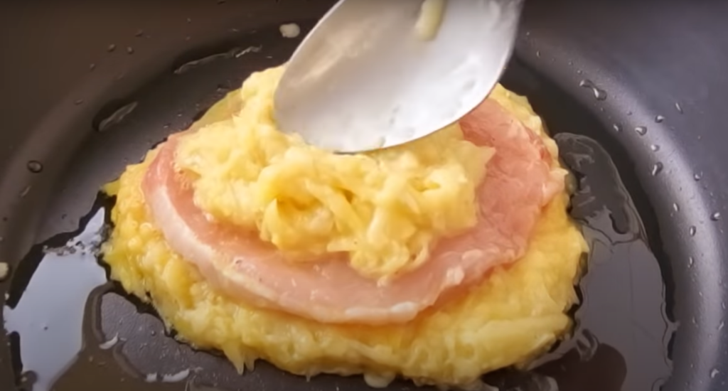 Przygotuj osobną miskę i wbij do niej pozostałe 2 jajka i roztrzep widelcem. Na patelnię wlej olej. Gdy już się nagrzeje, nałóż łyżką warstwę przygotowanych wcześniej ziemniaków, następnie obtocz plaster mięsa w jajku i połóż na górę, na samą górę daj znów warstwę ziemniaków. Smaż z obu stron przez 2-3 minuty.